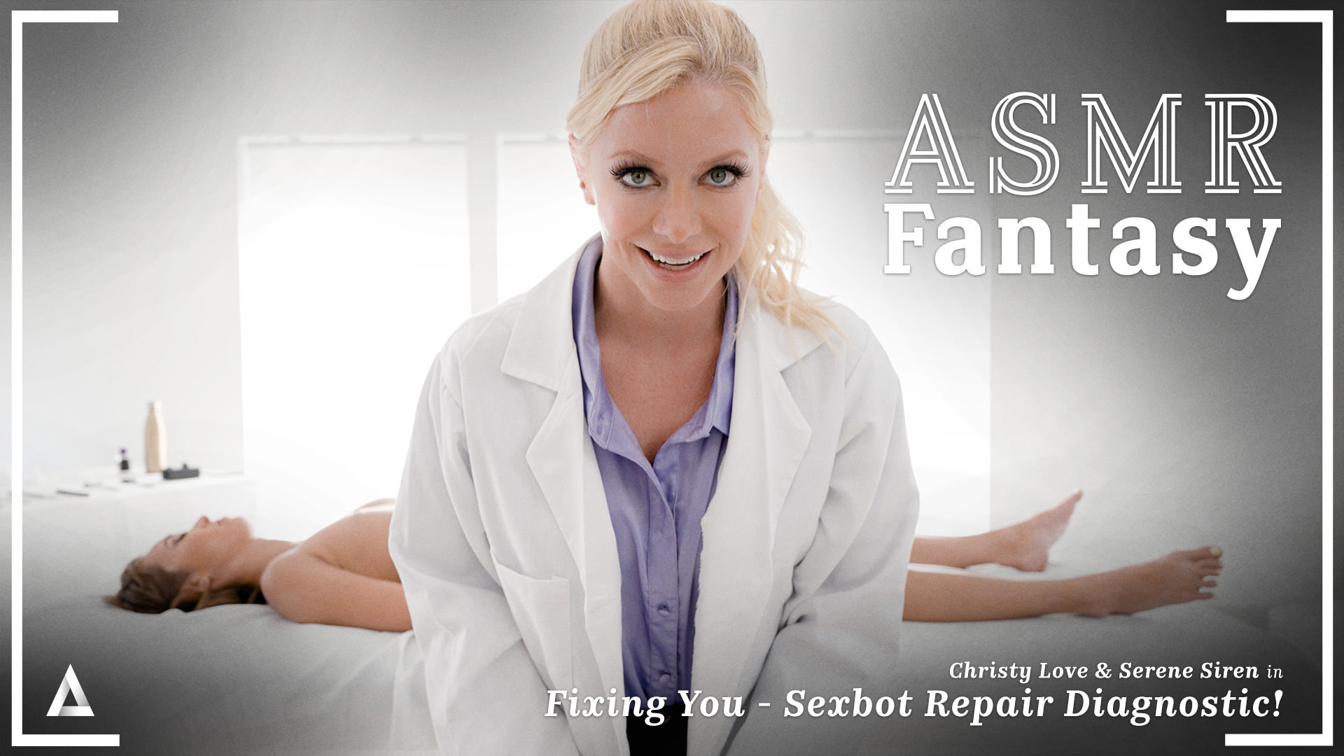 Get ready for an incredible immersive experience with ASMR FANTASY, an erotic roleplay series.Autonomous Sensory Meridian Response (ASMR) is the physical tingling sensation brought on by a number of triggers, such as whispers and other soothing sounds used by ASMRtists across the internet. ASMR FANTASY takes that feeling of satisfaction to new heights, with a wondrous level of intimacy.A technician, Serene Siren, enters the room and greets a beautiful android, Christy Love. Speaking in a soothing voice, Serene proudly tells Christy that she is the newest sexbot created by the experts at Pleasure Park. It is Serene's job to run a full diagnostic on Christy and test that she's ready for deployment. It's time to fix any remaining defects or bugs so that Christy's in tip-top shape for release, and YOU get to watch the thorough procedure!Serene cuts open the plastic tarp covering Christy and then pulls the tarp away, creating some satisfying crinkling sounds as she does so. While explaining everything that she's doing in her calming voice, Serene proceeds with working on Christy. She wipes Christy's eyes clean, uses a light to check her pupils, uses compressed air to clean her ears, and uses a tuning fork to test her hearing. Serene also uses an electric screwdriver to tighten some screws, tests the elasticity of Christy's skin, checks her reflexes, and makes sure Christy's 'squirt' fluid levels are correct. She then flicks some switches to do further tests on Christy, and applies lube to Christy's vagina to get it nice and wet. Of course, testing a sexbot's functionality would not be complete without having sex with her, so naturally Serene has sex with Christy as well, while you get to enjoy the sight (and sounds)!This video contains whispering and soft-spoken words, plastic crinkling sounds, whooshing sounds, tuning fork sounds, electric screwdriver sounds, skin contact sounds, wet sounds, flicking switch sounds, tapping sounds, and binaural/3D audio.