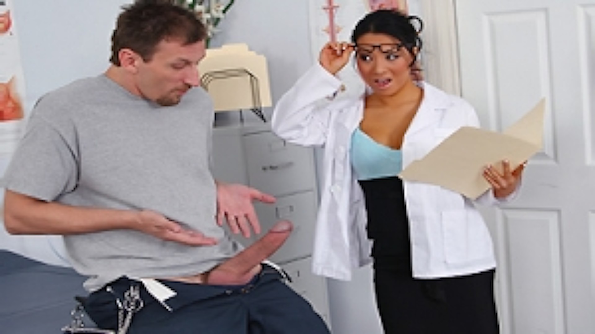 Mark asks Dr. Akira for a penis enlargement after realizing that his wife wants a porn sized penis. After Dr. Akira analyzes the situation she realizes that there's is really no need to extend his already huge cock. While looking at the size of it she cant resist not sticking it in her mouth and sucking on it, which of course leads to a major, MAJOR, pounding!